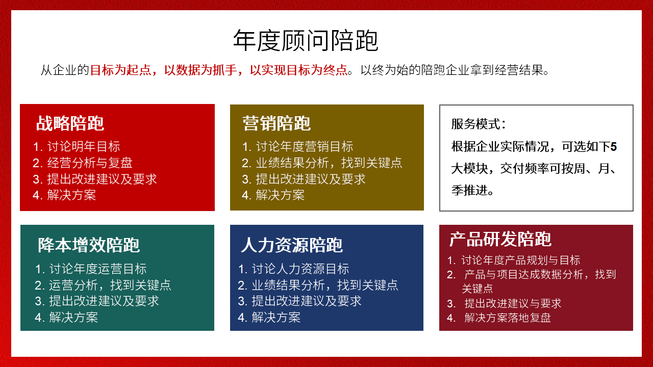 破解經(jīng)營困惑,解決關(guān)鍵卡點,以目標為起點,陪跑企業(yè)拿到更好經(jīng)營結(jié)果