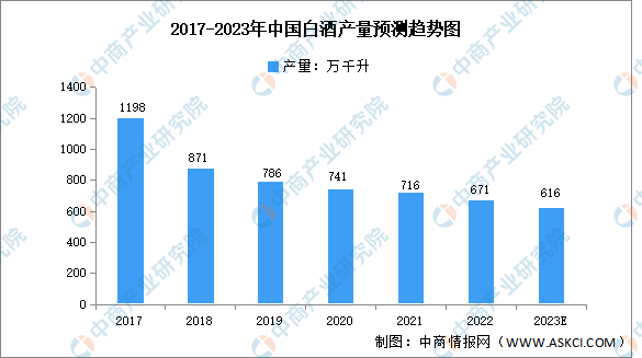 在消費(fèi)市場(chǎng)環(huán)境變化、年輕消費(fèi)者口味變化、限制“三公”消費(fèi)、“禁酒令”等多方面因素的影響下,我國(guó)白酒產(chǎn)量逐年下降。2022年,全國(guó)白酒累計(jì)產(chǎn)量671萬(wàn)千升,同比下滑5.6%。這是2017年以來(lái)全國(guó)白酒產(chǎn)量連續(xù)第六年下跌。預(yù)計(jì)2023年我國(guó)白酒產(chǎn)量616萬(wàn)千升。