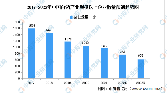我國(guó)白酒產(chǎn)業(yè)規(guī)模以上企業(yè)數(shù)量呈下降趨勢(shì),由2017年的1593家降至2021年的965家,現(xiàn)有企業(yè)競(jìng)爭(zhēng)激烈,白酒產(chǎn)業(yè)集中度進(jìn)一步提升。預(yù)計(jì)2023年我國(guó)白酒產(chǎn)業(yè)規(guī)模以上企業(yè)數(shù)量605家。