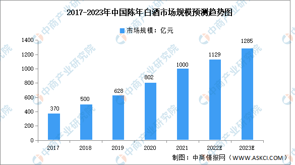 陳年白酒是由具備白酒生產(chǎn)資質(zhì)企業(yè)以傳統(tǒng)白酒工藝釀造,出廠10年以上,且保存完好的白酒產(chǎn)品。近年來(lái),茅臺(tái)酒、五糧液、汾酒、瀘州老窖特曲等品牌的陳年酒市場(chǎng)規(guī)模高速增長(zhǎng),由2017年的370億元增長(zhǎng)至2021年的1000億元,復(fù)合年均增長(zhǎng)率達(dá)28.2%。未來(lái),隨著國(guó)民消費(fèi)水平進(jìn)一步提高,預(yù)計(jì)2023年我國(guó)陳年白酒市場(chǎng)規(guī)模將達(dá)1285億元。