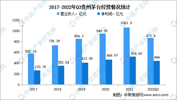 貴州茅臺(tái)主導(dǎo)產(chǎn)品“貴州茅臺(tái)酒”是世界三大蒸餾名酒之一,也是集國(guó)家地理標(biāo)志產(chǎn)品、有機(jī)食品和國(guó)家非物質(zhì)文化遺產(chǎn)于一身的白酒品牌。2021年,貴州茅臺(tái)累計(jì)實(shí)現(xiàn)白酒產(chǎn)量17.1萬(wàn)噸,實(shí)現(xiàn)營(yíng)業(yè)收入1061.9億元,凈利潤(rùn)達(dá)524.6億元。2022年前三季度實(shí)現(xiàn)營(yíng)業(yè)收入871.6億元,凈利潤(rùn)444億元。