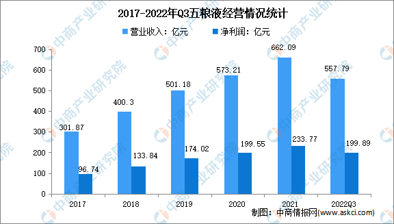 五糧液主要產(chǎn)品“五糧液酒”是我國(guó)濃香型白酒的典型代表。同時(shí),五糧液根據(jù)生產(chǎn)工藝特點(diǎn)開(kāi)發(fā)了五糧春、五糧醇、五糧特曲、尖莊等品類齊全、層次清晰的系列酒產(chǎn)品。2021年,五糧液營(yíng)業(yè)收入達(dá)662.09億元,凈利潤(rùn)實(shí)現(xiàn)233.77億元。2022年前三季度實(shí)現(xiàn)營(yíng)業(yè)收入557.79億元,凈利潤(rùn)199.89億元。