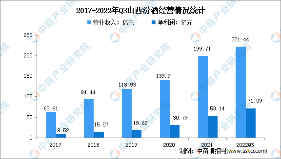 山西汾酒的主要產(chǎn)品汾酒是我國(guó)清香型白酒的典型代表,竹葉青酒是著名的保健養(yǎng)生酒,在國(guó)內(nèi)外享譽(yù)盛名。山西汾酒2021年實(shí)現(xiàn)營(yíng)業(yè)收入199.71億元,凈利潤(rùn)53.14億元。2022年前三季度實(shí)現(xiàn)營(yíng)業(yè)收入221.44億元,實(shí)現(xiàn)凈利潤(rùn)71.09億元。