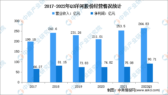 洋河股份是全國(guó)大型白酒生產(chǎn)企業(yè),是白酒行業(yè)唯一擁有洋河、雙溝兩大中國(guó)名酒,兩個(gè)中華老字號(hào),六枚中國(guó)馳名商標(biāo)的企業(yè)。洋河股份主導(dǎo)產(chǎn)品夢(mèng)之藍(lán)、天之藍(lán)、海之藍(lán)、蘇酒、珍寶坊、洋河大曲、雙溝大曲等系列白酒,在全國(guó)享有較高的品牌知名度和美譽(yù)度。2021年,洋河股份營(yíng)業(yè)收入達(dá)253.5億元,凈利潤(rùn)達(dá)75.08億元。2022年前三季度,洋河股份實(shí)現(xiàn)營(yíng)業(yè)收入264.83億元,凈利潤(rùn)達(dá)90.71億元。
