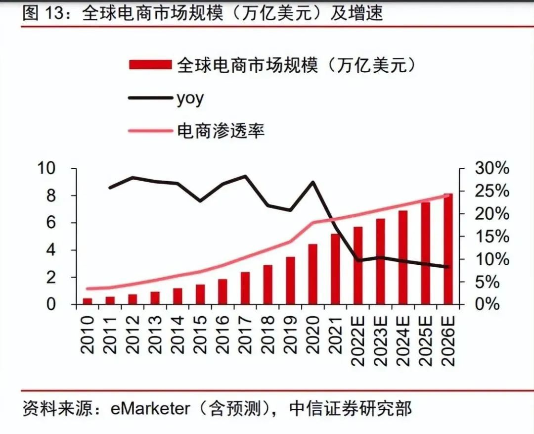 疫后消費(fèi)線上化趨勢延續(xù),2026 年全球電商滲透率有望達(dá) 24%。疫情加速培育全球用戶電商消費(fèi)習(xí)慣,根據(jù) eMarketer,全球電商市場規(guī)模 2019-2021 年 CAGR 為 22%。盡管全球疫情已進(jìn)入常態(tài)化防控階段,但消費(fèi)者線上購物的習(xí)慣仍然得以保持,根據(jù)相關(guān)數(shù)據(jù)顯示,疫情后依然會偏好線上購物的用戶數(shù)在不同品類提升 5%-15%。消費(fèi)線上化趨勢下,根據(jù) eMarketer,預(yù)計(jì) 2026 年全球電商市場規(guī)模有望達(dá) 8.1 萬億美元,2022-2026 年 CAGR 為 9%,2026 年全球電商滲透率有望達(dá) 24%。