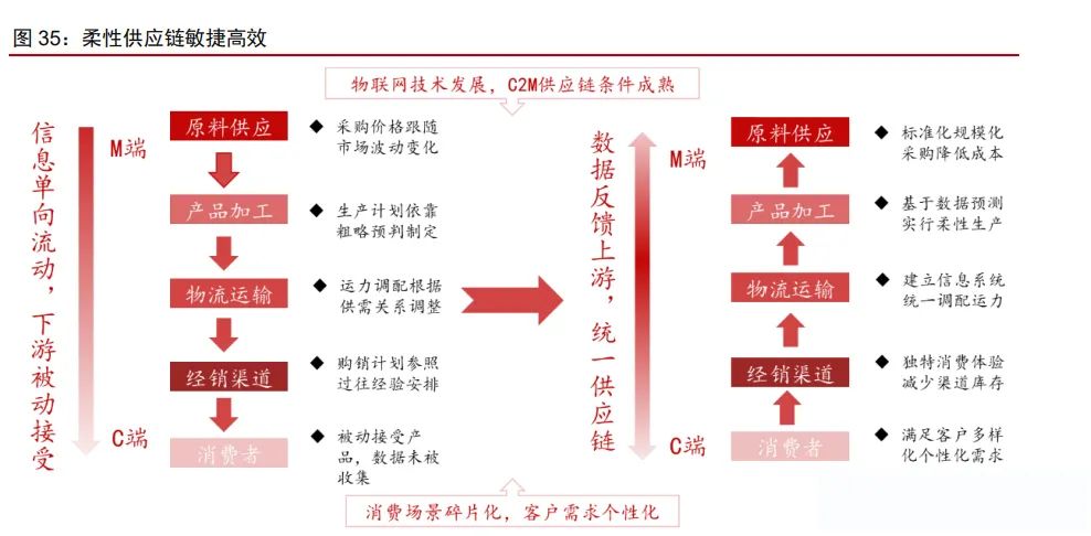 柔性供應(yīng)鏈高度敏捷,更快捕捉趨勢性機(jī)會。中國供應(yīng)鏈高度靈活敏捷,對傳統(tǒng)供應(yīng) 鏈的數(shù)字化賦能、消費(fèi)者數(shù)據(jù)的沉淀以及逆向反饋使得工廠具有按需生產(chǎn)的能力,大幅降 低商家?guī)齑婧统杀緣毫Γ?ldquo;小單快反”的模式也能幫助商家更快地捕捉趨勢性機(jī)會。以柔性供應(yīng)鏈的極致踐行者 Shein 為例,根據(jù) Zara 財(cái)報(bào)及晚點(diǎn) LatePost,Shein 從收到訂單 到產(chǎn)品出廠/庫存周轉(zhuǎn)天數(shù)只需 5/30 天,生產(chǎn)及周轉(zhuǎn)效率明顯高于 Zara、H&M,而生產(chǎn)成 本僅為 Zara 的 30%-50%。