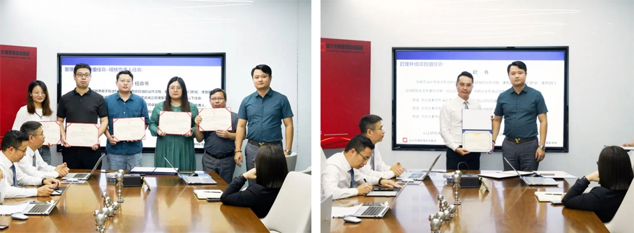 會(huì)上,李總為項(xiàng)目老師頒發(fā)了授權(quán)書,為各項(xiàng)目小組負(fù)責(zé)人頒發(fā)了任命書,共同宣誓投身變革。