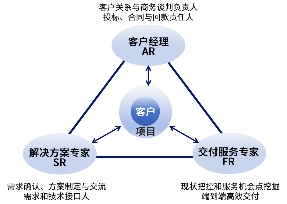 成立面向客戶的客戶關(guān)系、產(chǎn)品和解決方案、交付為核心的鐵三角組織