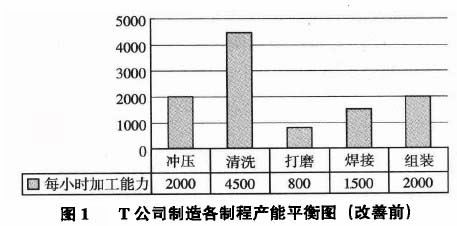 1)制造過程中由于各功能制造單位、制程產(chǎn)能不平衡,不可避免地造成加工能力低的制程前在制品(WIP)堆積,同時給后工站的作業(yè)帶來了極大的不便。圖1是T公司制造的一個產(chǎn)能平衡圖,T公司制造有沖壓、清洗、打磨、焊接、組裝共五個制程,有一個產(chǎn)品要順次經(jīng)過這五個制程,那么這個產(chǎn)能如何計算呢?要看瓶頸制程的加工能力。