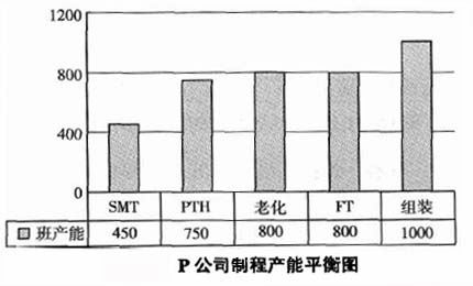 (4)其他。當設備比較昂貴時,管理及財務人員有傾向提高稼動率,生產(chǎn)過多的產(chǎn)品。下圖是P公司的一個案例,其內部各制程分別是SMT-PTH-老化-FT-組裝,其產(chǎn)能分布如下: