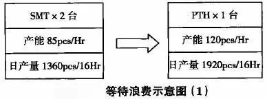 PTH日產(chǎn)量1920pce/16Hr,SMT日產(chǎn)量1360pce/16Hr,這樣安排的話,PTH制程上班的16個小時中有4.6個小時人和機處于等待狀態(tài)。