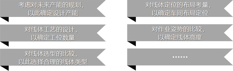 在線體規(guī)劃設計項目中,我們會充分考慮對未來產能的規(guī)劃,以此確定設計產能;對線體工藝的設計,以確定工位數量;對線體選型的比較,以此選擇合理的線體類型;對線體定位的布局考量,以確定車間布局定位;對作業(yè)姿勢的比較,以確定線體高度;對尺寸骨架的設計,以確定主體尺寸;對工裝吊架設計的考慮,以確定吊架方式選擇;對工位詳細布局,通過工藝模擬驗證;對輔助設施設置的考慮,以滿足特殊需求;對外部接口的考慮,以提前預留對外施工接口。以實現線體規(guī)劃的有效性及合理性。