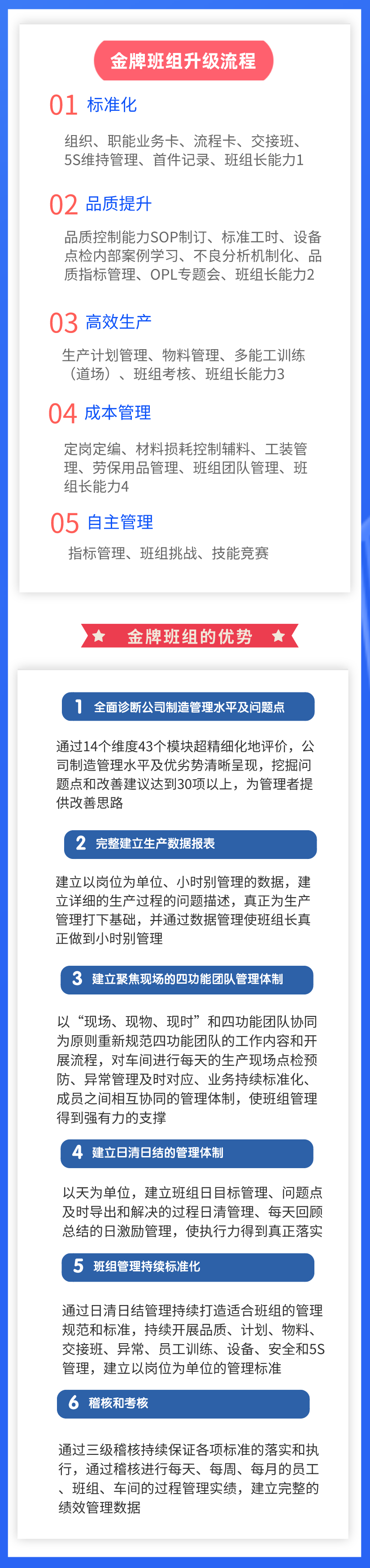 遠(yuǎn)大咨詢集團(tuán)根據(jù)100多家企業(yè)服務(wù)經(jīng)驗(yàn)開(kāi)發(fā)基層班組管理咨詢產(chǎn)品。以推進(jìn)班組管理各方面業(yè)務(wù)的標(biāo)準(zhǔn)化開(kāi)始,從班組管理規(guī)范化開(kāi)始,逐步推進(jìn)班組的品質(zhì)管理能力,效率管理能力,成本管理能力,逐步達(dá)到班組自主管理的程度。