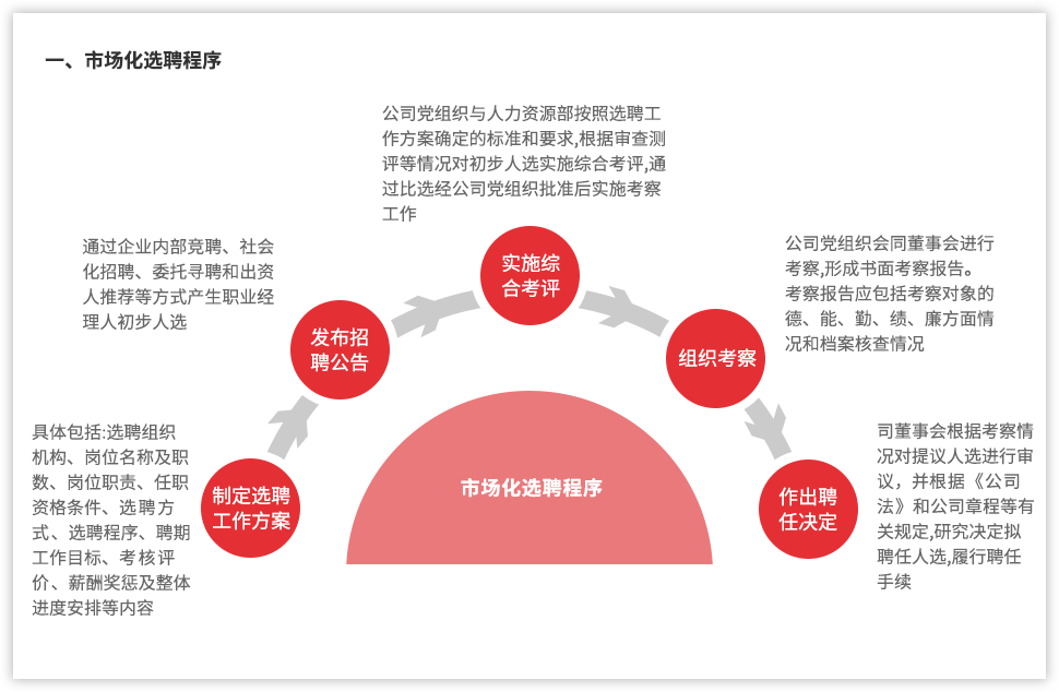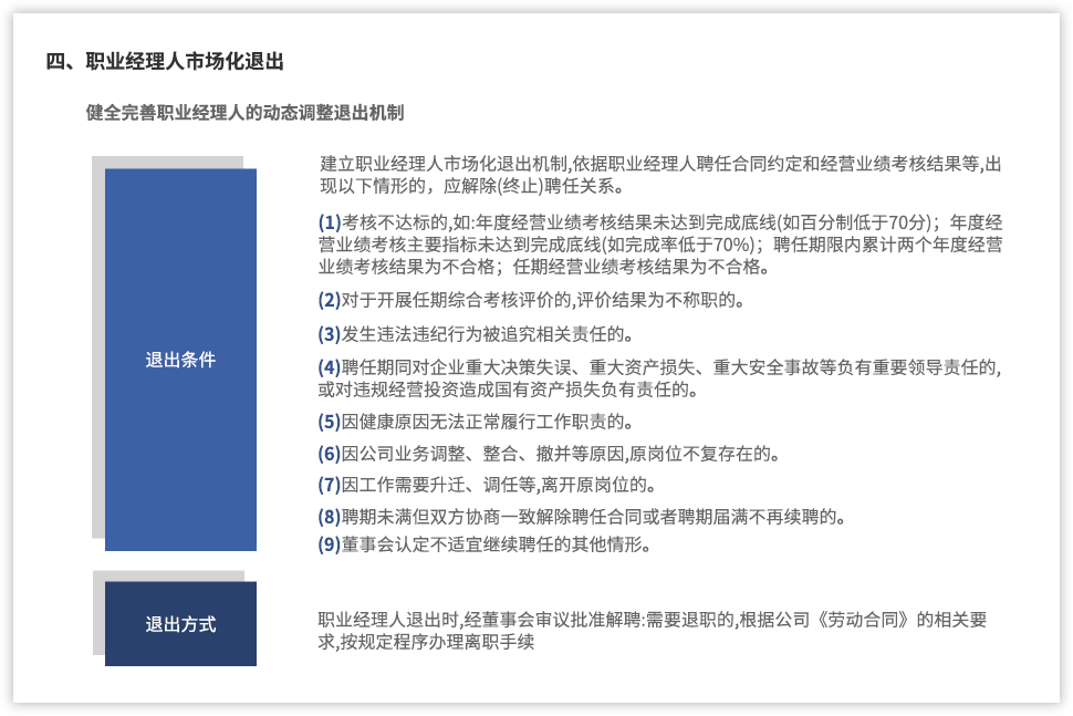 職業(yè)經(jīng)理人改革的核心目的是自上而下地為企業(yè)建立市場化的經(jīng)營機制和激勵約束機制,推動國有企業(yè)市場主體地位的落實,增強、釋放企業(yè)發(fā)展活力和潛力。遠大方略認為,職業(yè)經(jīng)理人改革是一個體系工程,其實施需要以公司治理結(jié)構(gòu)完善為先決條件,以人才發(fā)展體制機制改革為制度基礎,以契約化管理和有效的考核、激勵、約束機制作為保障,涵蓋戰(zhàn)略引導、治理機制、崗位價值、薪酬策略、激勵前設、契約管理等多個方面。