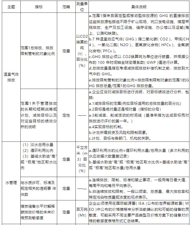 煤炭作業(yè)產(chǎn)業(yè)包括開(kāi)采煤炭的企業(yè)和制造煤炭產(chǎn)品的企業(yè),開(kāi)采活動(dòng)分為地下開(kāi)采和露天開(kāi)采,開(kāi)采對(duì)象分為普通煤和原料煤。煤炭行業(yè)屬于資源密集型,作業(yè)過(guò)程直接產(chǎn)生較多溫室氣體。該準(zhǔn)則要求相關(guān)企業(yè)在溫室效應(yīng)煤煙排放方面對(duì)溫室氣體排放量進(jìn)行直接披露,并對(duì)企業(yè)短期、長(zhǎng)期的減排計(jì)劃與目標(biāo)按要求進(jìn)行信息披露。對(duì)水資源的管理主要側(cè)重于對(duì)水的循環(huán)利用、合規(guī)利用方面的披露。儲(chǔ)備評(píng)估及資本支出方面?zhèn)戎赜趯?duì)煤炭產(chǎn)業(yè)未來(lái)氣候相關(guān)影響的預(yù)測(cè)。此外,針對(duì)煤炭行業(yè)的開(kāi)采對(duì)象,該準(zhǔn)則還要求對(duì)普通煤生產(chǎn)量(百萬(wàn)噸)和原料煤生產(chǎn)量(百萬(wàn)噸)進(jìn)行披露。