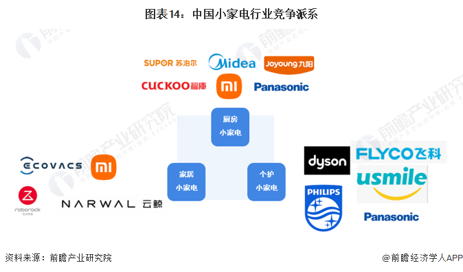 根據(jù)各市場主體主營產(chǎn)品的類型差異,中國小家電行業(yè)可以劃分為三個競爭派系。廚房小家電領(lǐng)域的主要參與者有美的集團(tuán)、蘇泊爾、九陽股份、松下電器等;家居小家電產(chǎn)品主要包括掃地機器人、洗地機、無線吸塵器等產(chǎn)品,參與者包括科沃斯、石頭科技、小米科技、云鯨等品牌;個護(hù)小家電產(chǎn)品主要包括電吹風(fēng)、電動剃須刀、電動牙刷等產(chǎn)品,市場參與者包括戴森、飛利浦、飛科電器、松下電器、USMILE等。