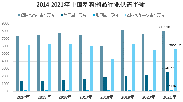 根據(jù)海關數(shù)據(jù),2021年我國塑料制品行業(yè)進口171.82萬噸,出口2540.77萬噸,結合國內(nèi)產(chǎn)量來看,2021年我國塑料制品行業(yè)表觀需求量達到5635.03萬噸。