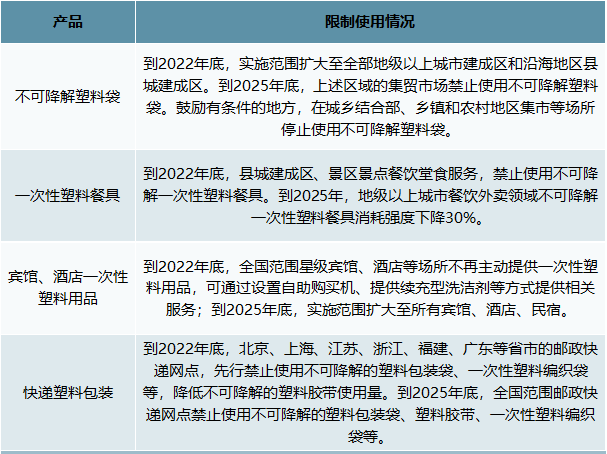 國家發(fā)展改革委、生態(tài)環(huán)境部印發(fā)《關于進一步加強塑料污染治理的意見》,明確提出了進一步加強塑料污染治理的“時間表”:2020年率先在部分地區(qū)、領域禁限生產(chǎn)、銷售和使用部分塑料制品。2022年一次性塑料制品消費量明顯減少,替代產(chǎn)品得到推廣。2025年塑料制品全環(huán)節(jié)管理制度建立,塑料污染得到有效控制。做好塑料污染治理,全國各省在展開協(xié)同作戰(zhàn),陸續(xù)推出的限塑禁塑時表。