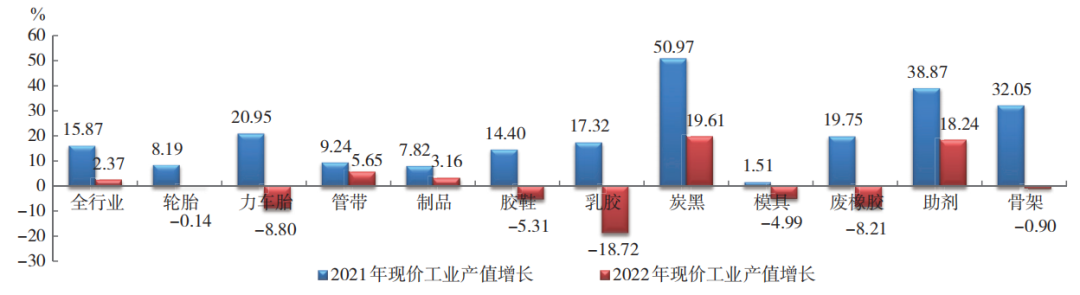2022年,橡膠行業(yè)現(xiàn)價工業(yè)總產(chǎn)值增長2.37%,增幅減少13.50個百分點。