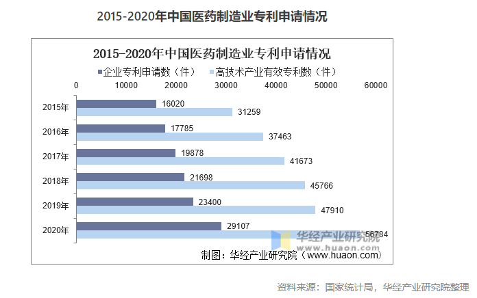 作為技術(shù)含量最高的行業(yè)之一,醫(yī)藥制造業(yè)必須不斷投入新藥品的研發(fā),提升行業(yè)整體創(chuàng)新能力和研發(fā)水平,才能提高醫(yī)藥制造業(yè)的競爭力。根據(jù)國家統(tǒng)計(jì)局?jǐn)?shù)據(jù)顯示2020年我國醫(yī)藥制造業(yè)企業(yè)專利申請數(shù)為29107個(gè),高技術(shù)產(chǎn)業(yè)專利有效數(shù)56784件,同比增長18.7%