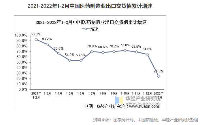 出口交貨值保持較快增長態(tài)勢。受海外疫情持續(xù)爆發(fā)影響,防疫物資產(chǎn)品出口需求強(qiáng)勁,支撐醫(yī)藥制造業(yè)出口保持較快增長。截至2022年1-2月,醫(yī)藥制造業(yè)出口交貨值同比增長24.3%,在去年高基數(shù)的情況下繼續(xù)保持高速增長,較工業(yè)平均水平高7.4個(gè)百分點(diǎn)